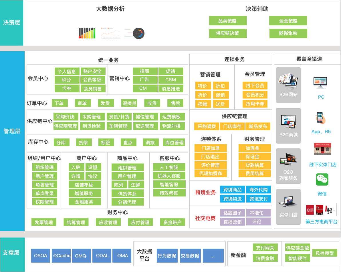全渠道O2O解决方案,是一套帮助传统零售企业整合了线上销售、线下实体门店零售,统一收银,结合产品分销,业务考核,客户沉淀,多平台订单物流统一管理的综合系统。帮助商家融合线上及线下业务,实现会员,订单,仓储,收银打通,引领全新商业模式,助力销售业绩腾飞。